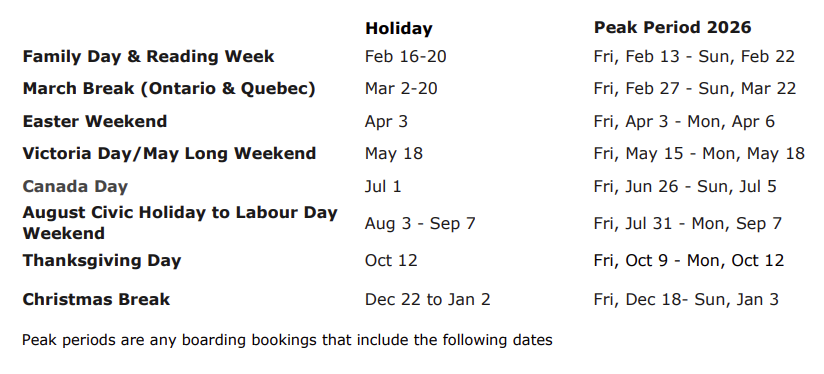 Peak Period Cancellation: At least 10 days prior to the arrival date. Peak periods include statutory holidays and long weekends.